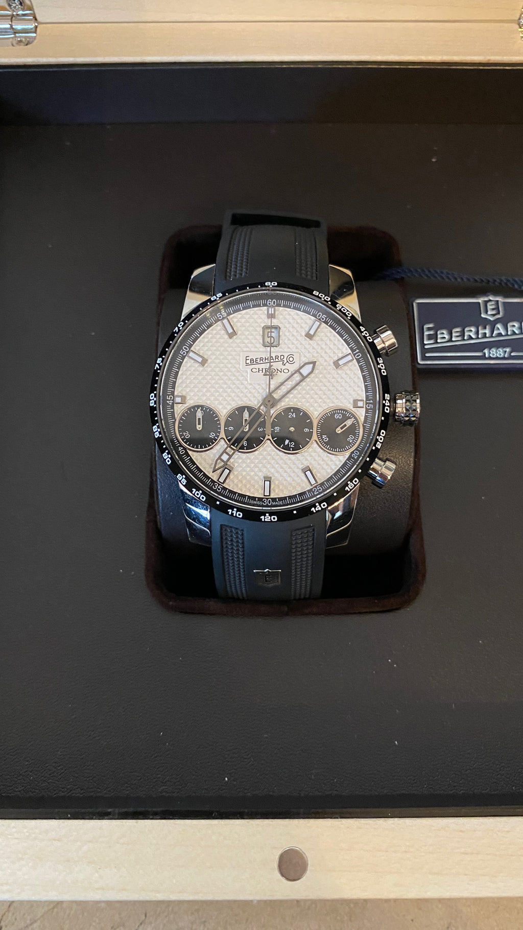 Orologio uomo eberhard, 31073CN CU.5 , Chrono 4 21-42, collezione chrono 4 grande taille, movimento automatico, cronografo, cassa in acciaio 42mm, quadrante bianco con datario, dispositivo eberhard & co.