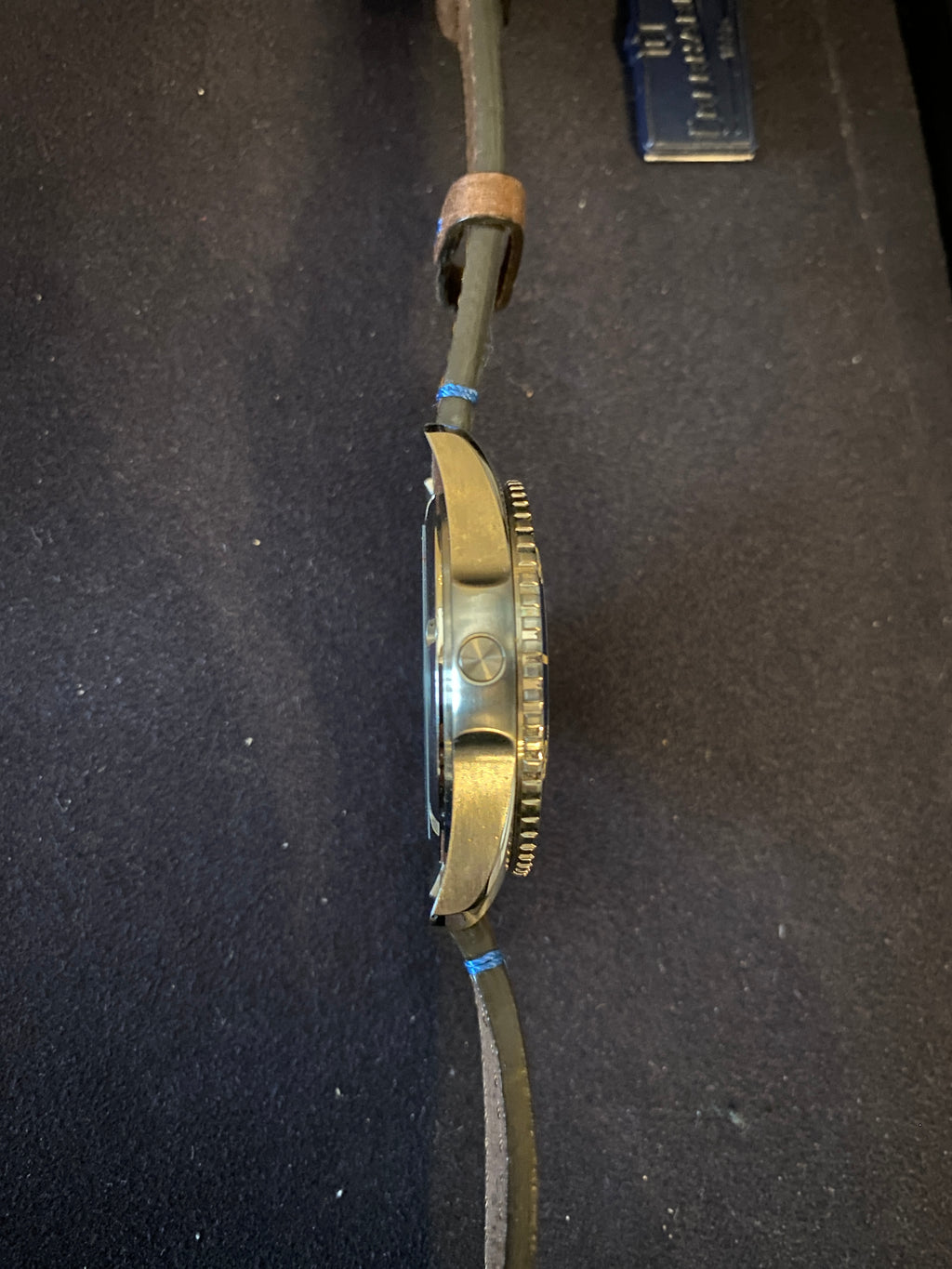 Quadrante Blu con Finitura Matt, Galbè, Personalizzato con Il Nome del Modello in Bianco. Indici Applicati, Tondi e di Forma Triangolare a ore 6-9-12, con Luminescenza Vintage.