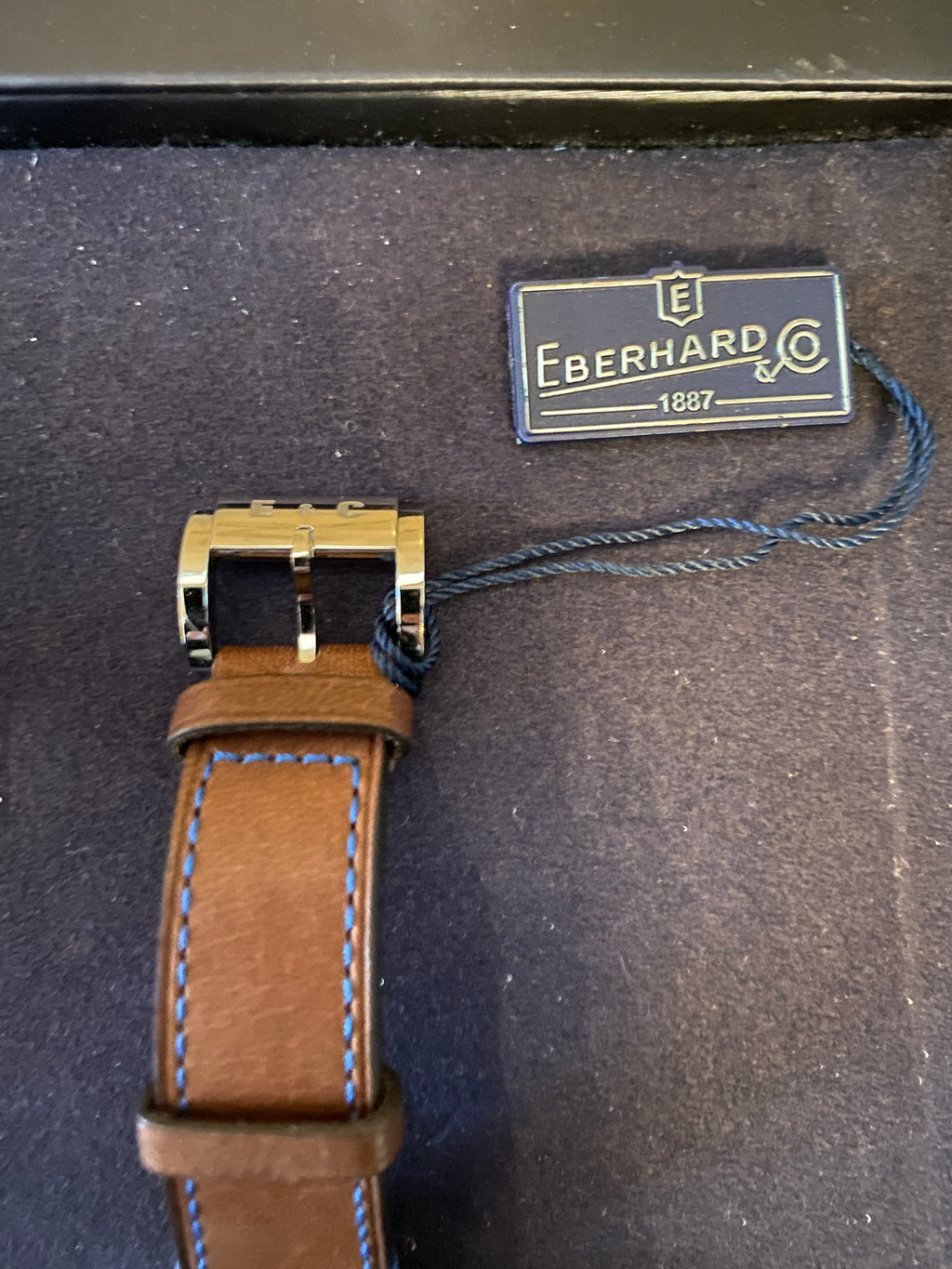 Cinturino in Pelle di Colore Marrone, con Impunture Blu dal Look Vintage. Chiusura con Logo Eberhard.