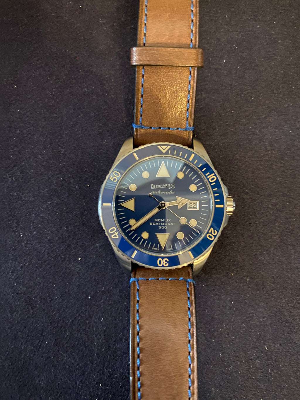 Orologio Uomo in Pelle Marrone con Quadrante Blu della Collezione Scafograf 300 MCMLIX di Eberhard.